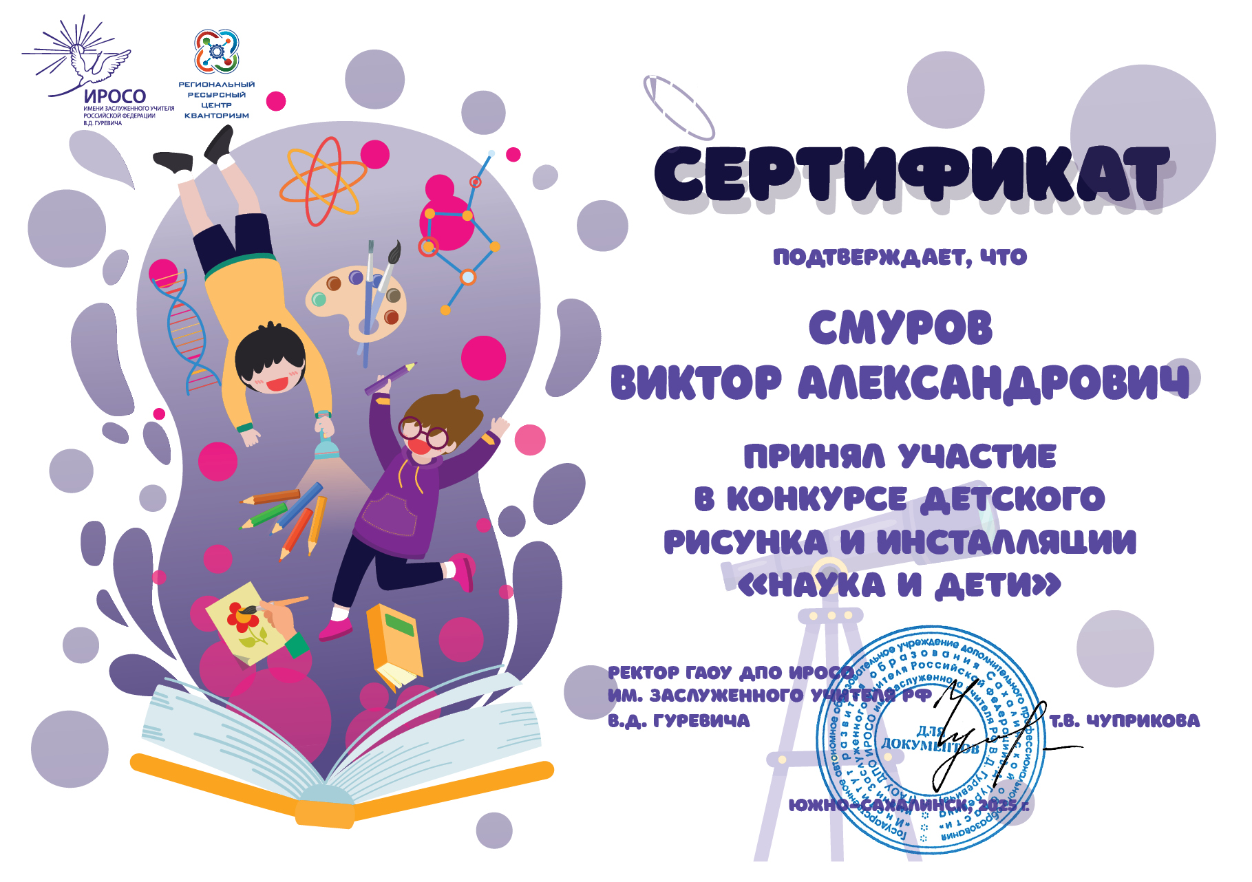 Сертификат выдан Смурову Виктору за участие в конкурсе детского рисунка и инсталляции "Наука и дети" - 2025 г.