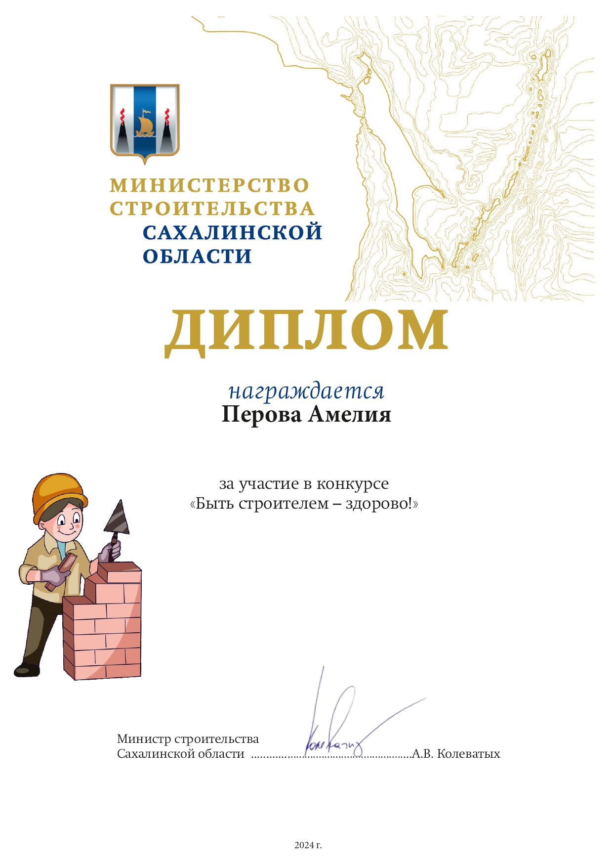 Диплом воспитанницы Перовой Амелии за участие в областном конкурсе "Быть строителем - здорово!" - 2024 г.