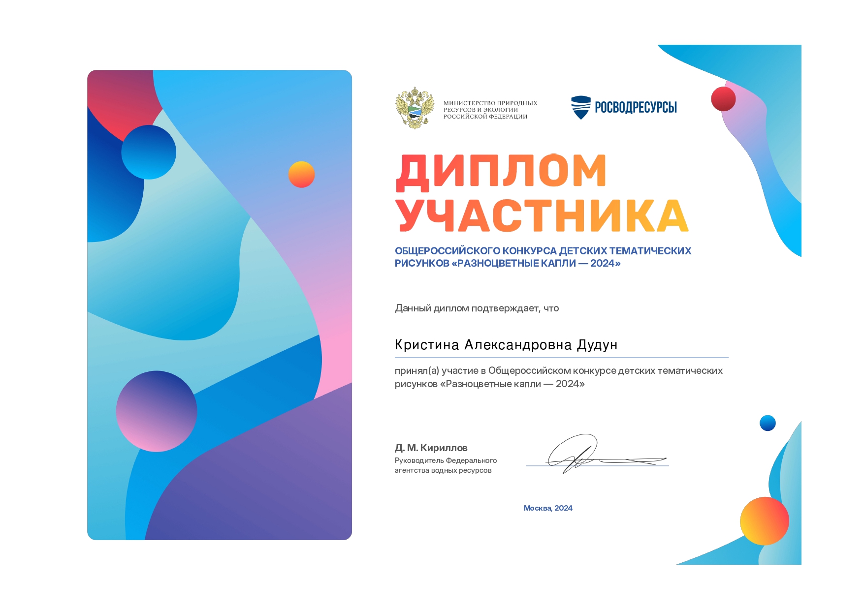 Диплом Дудун Кристины за участие в общероссийском конкурсе детских тематических рисунков "Разноцветные капли - 2024" - 2024 г.