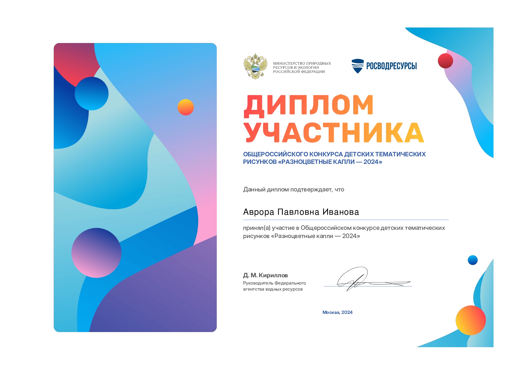 Диплом Ивановой Авроры за участие в общероссийском конкурсе детских тематических рисунков "Разноцветные капли - 2024" - 2024 г.