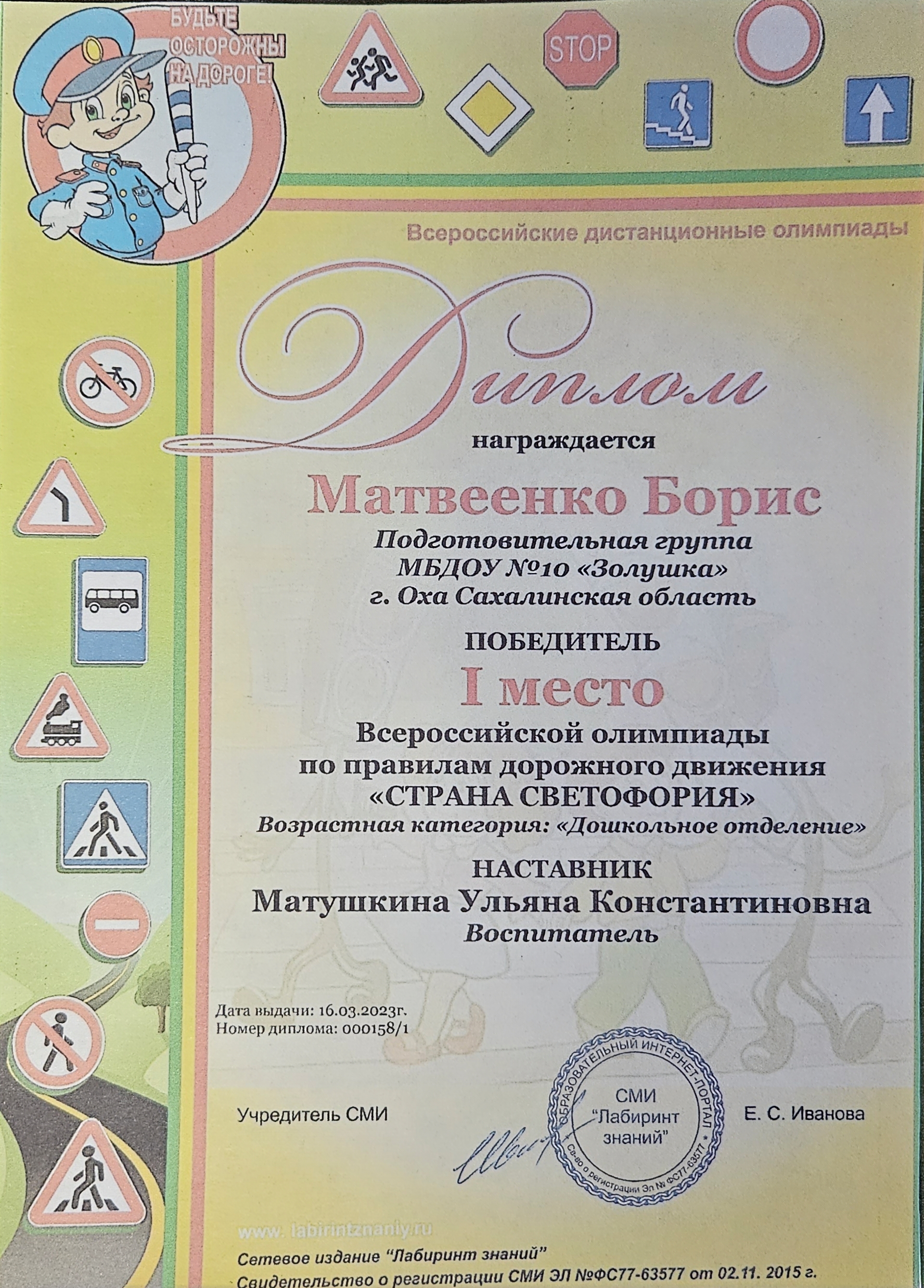 Диплом Матвеенко Бориса победителя во Всероссийской олимпиаде по правилам дорожного движения "Страна Светофория" 2023 г.