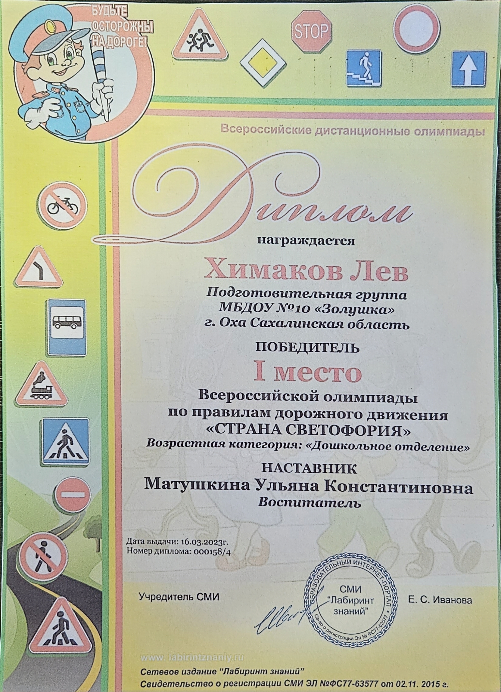 Диплом Химакова Льва победителя во Всероссийской олимпиаде по правилам дорожного движения "Страна Светофория" 2023 г.