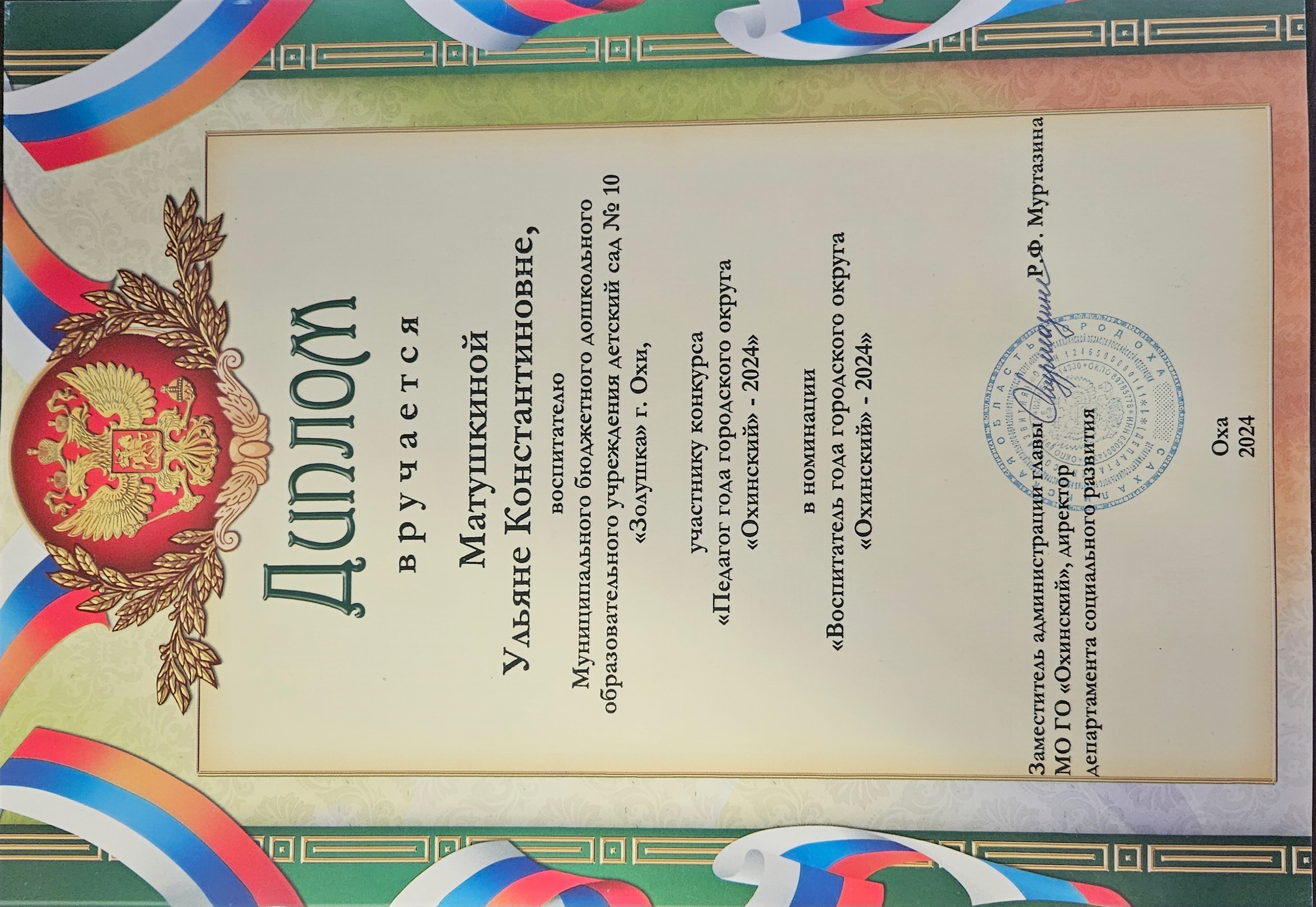 Диплом участнику конкурса "Педагог года городского округа "Охинский - 2024"