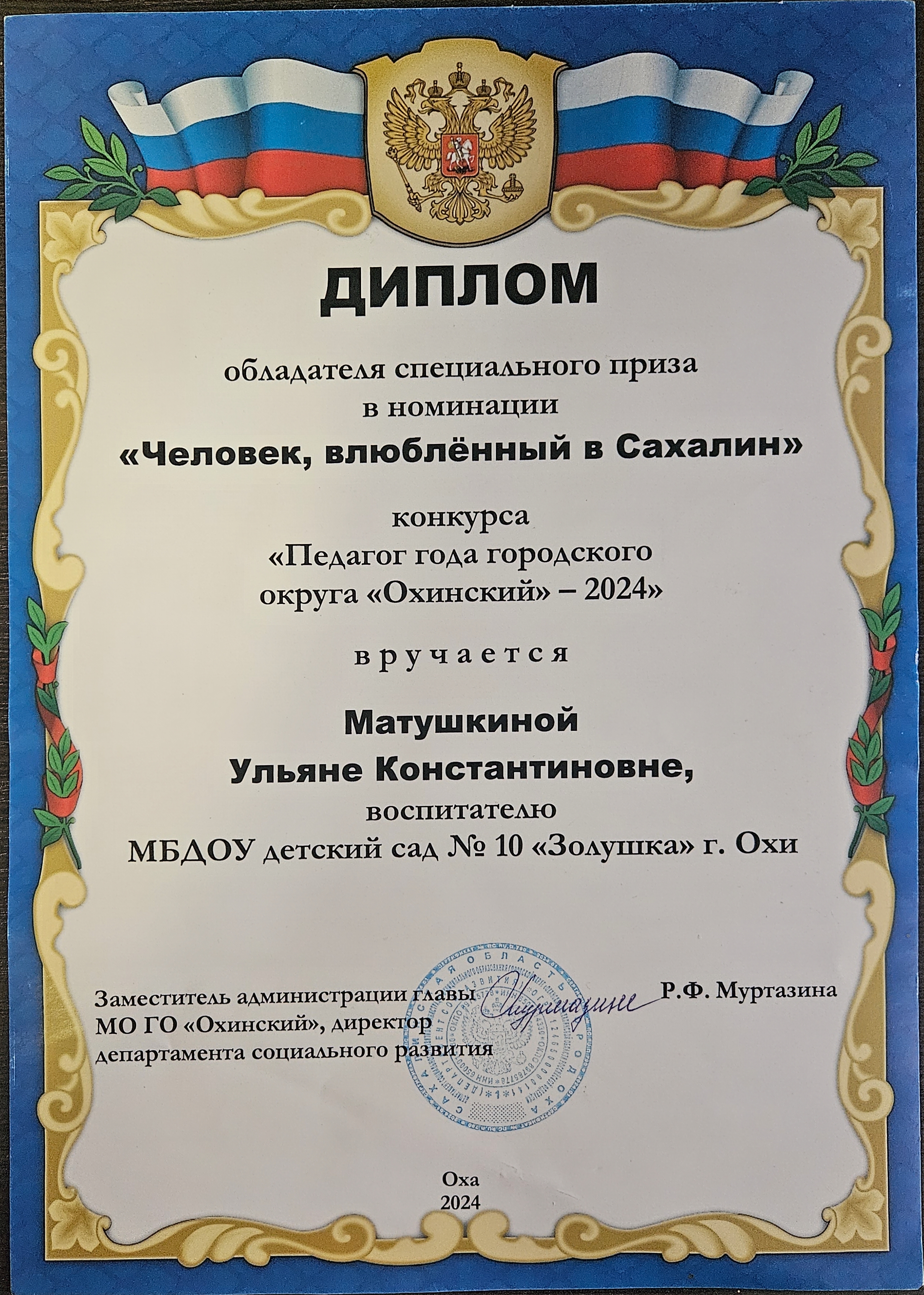Диплом обладателя специального приза конкурса "Педагог года городского округа "Охинский - 2024"