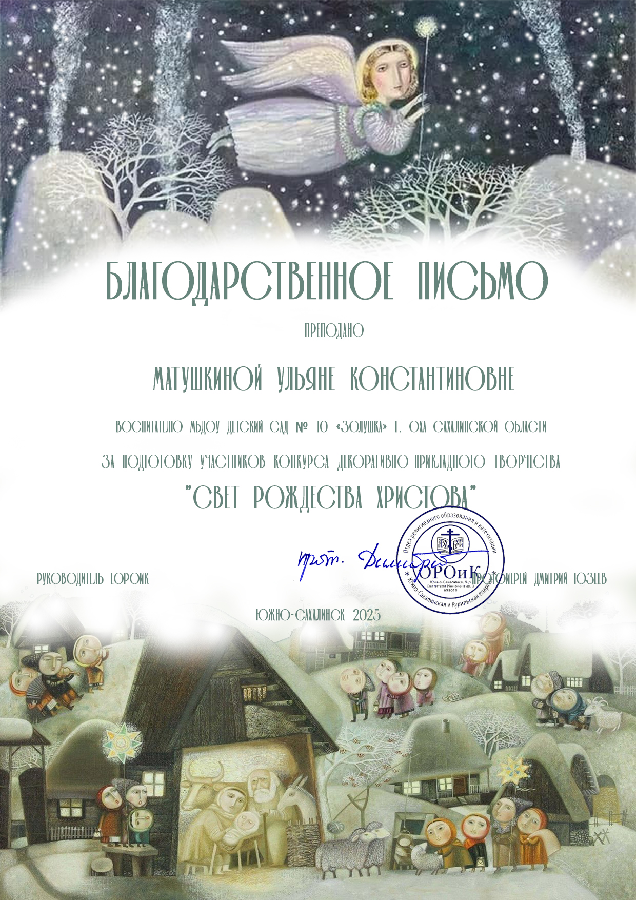 Благодарственное письмо за подготовку участника конкурса декоративно - прикладного творчества "Свет Рождества Христова" - 2025 г.