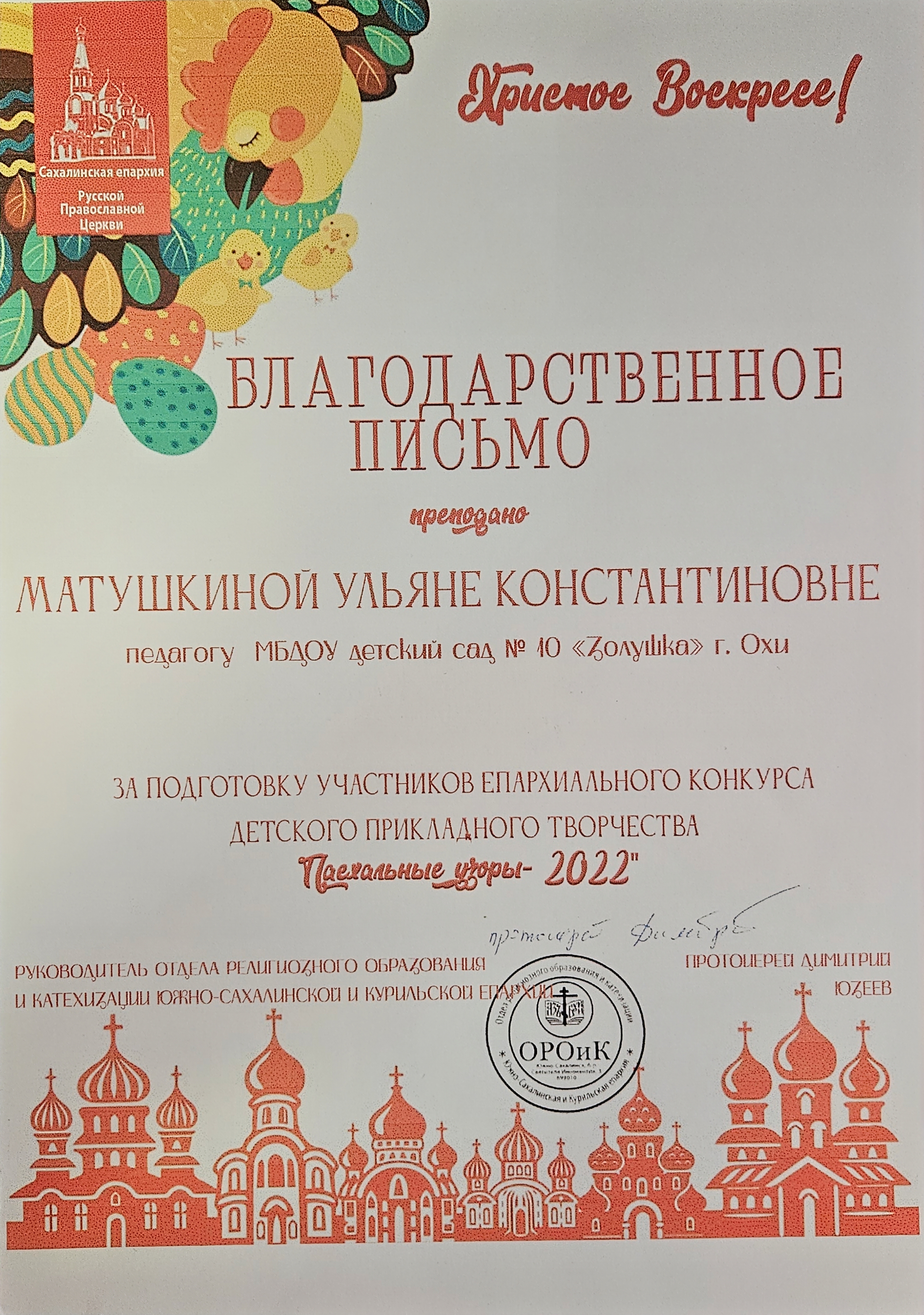 Благодарственное письмо за подготовку участника конкурса декоративно - прикладного творчества "Пасхальные узоры - 2022" - 2022 г.