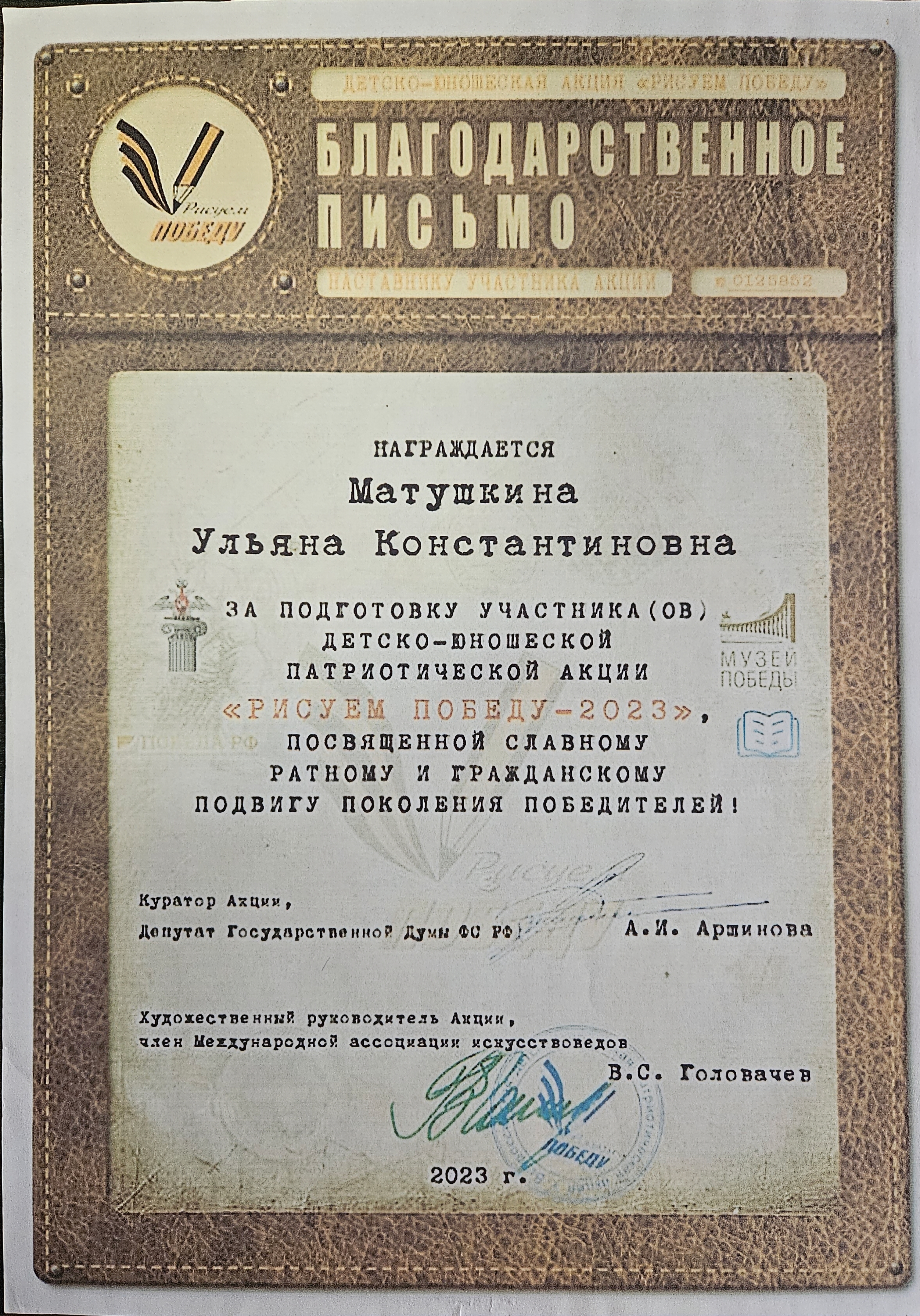 Благодарственное письмо за подготовку участников детско - юношеской патриотической акции "Рисуем победу" - 2023" 2023 г. 2023 г.