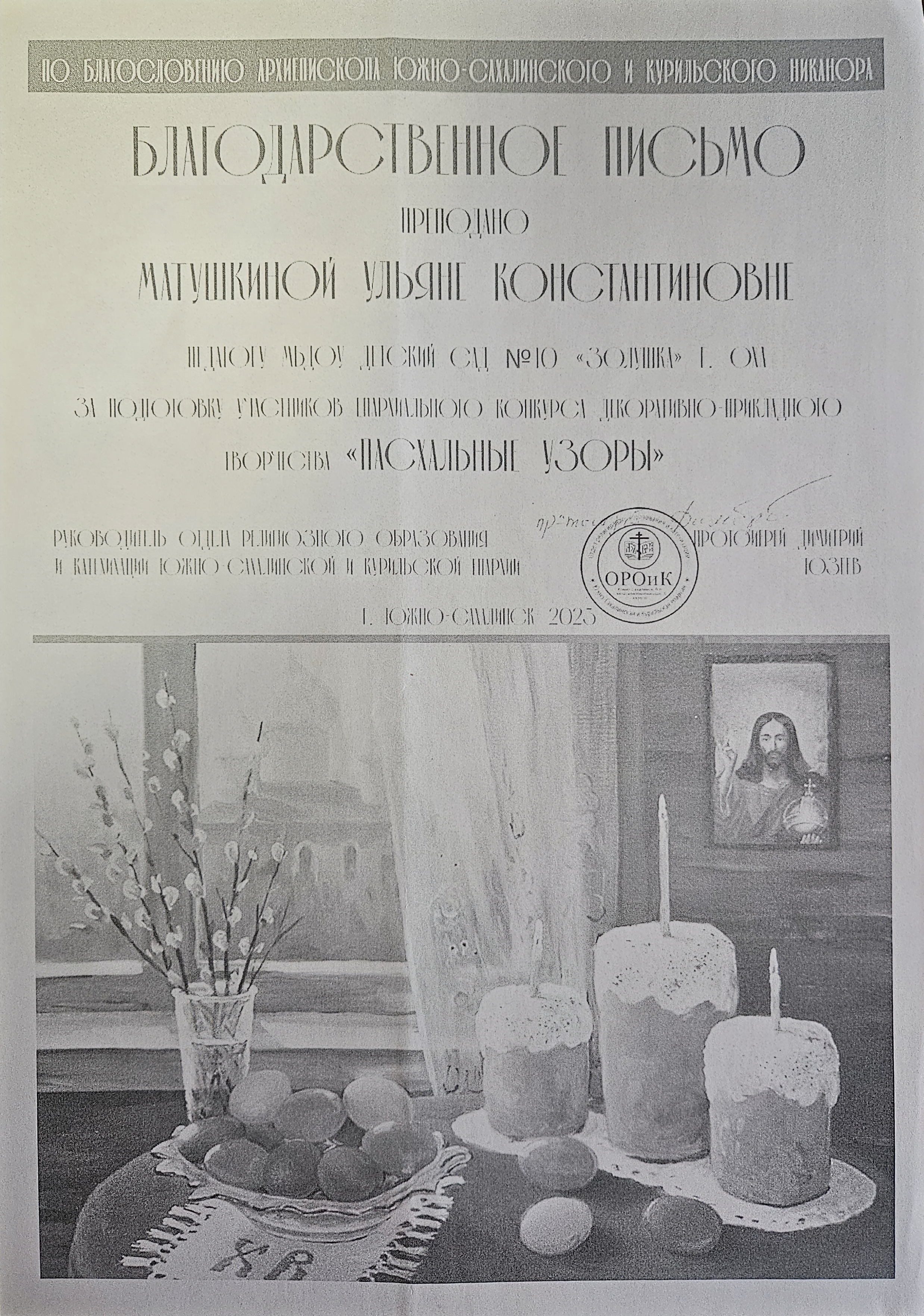 Благодарственное письмо за подготовку участника конкурса декоративно - прикладного творчества "Пасхальные узоры - 2023" - 2023 г.