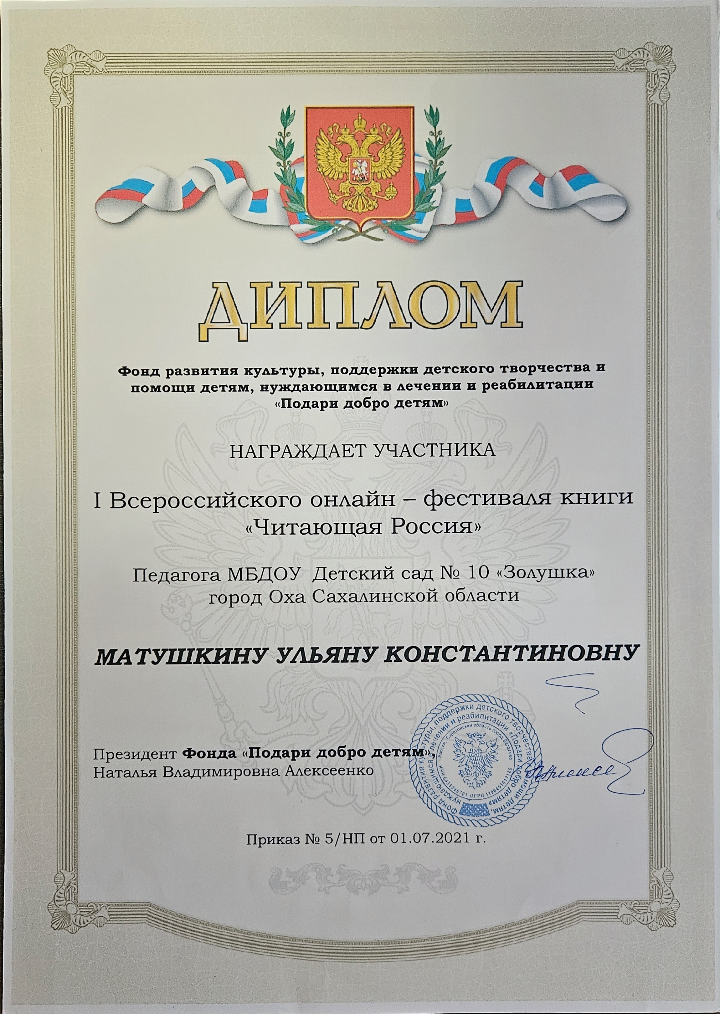 Диплом I Всероссийского онлайн - фестиваля книги "Читающая Россия" 2021 г.