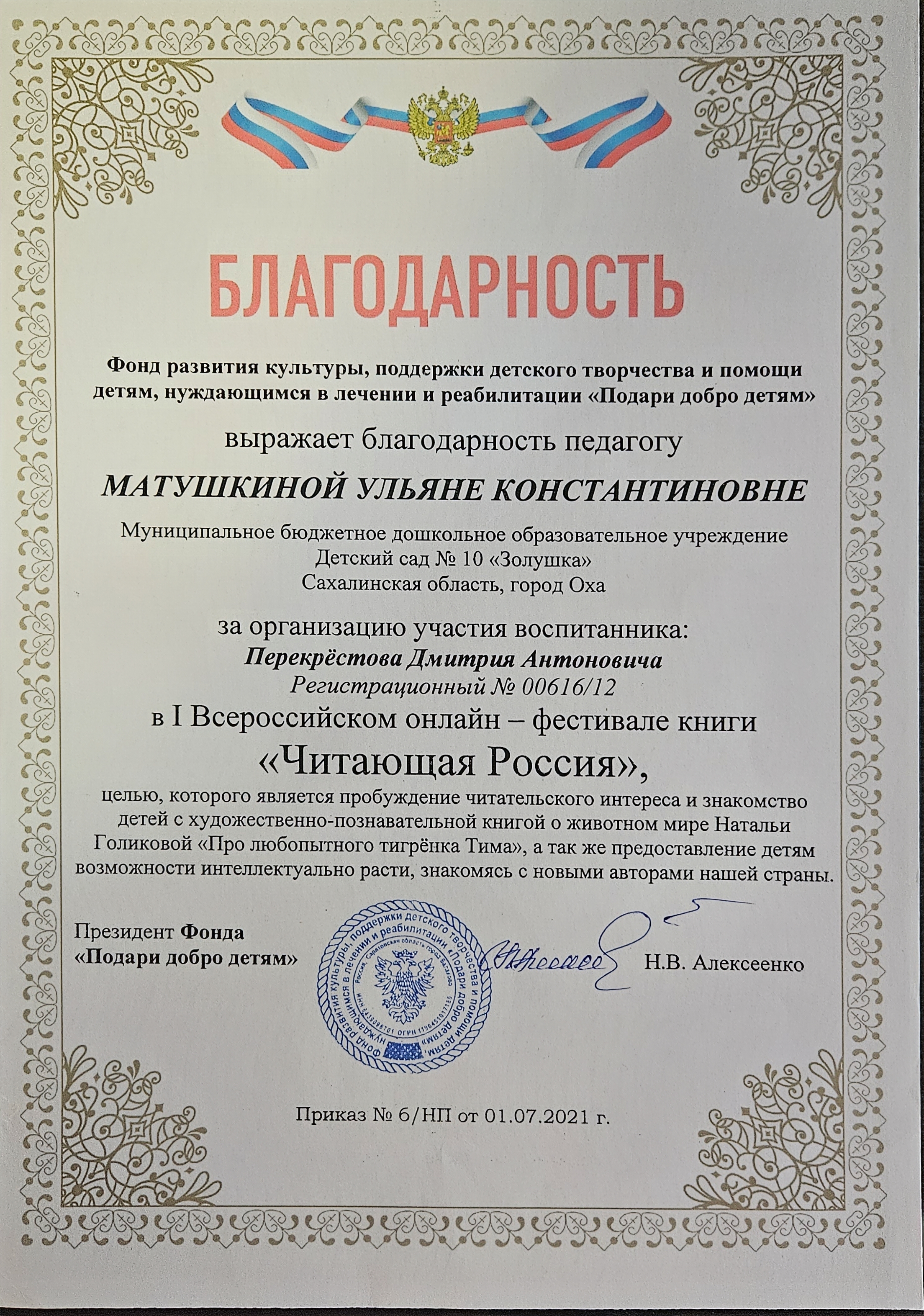Благодарность за организацию участия воспитанника в I Всероссийском онлайн - фестивале книги "Читающая Россия" 2021 г.