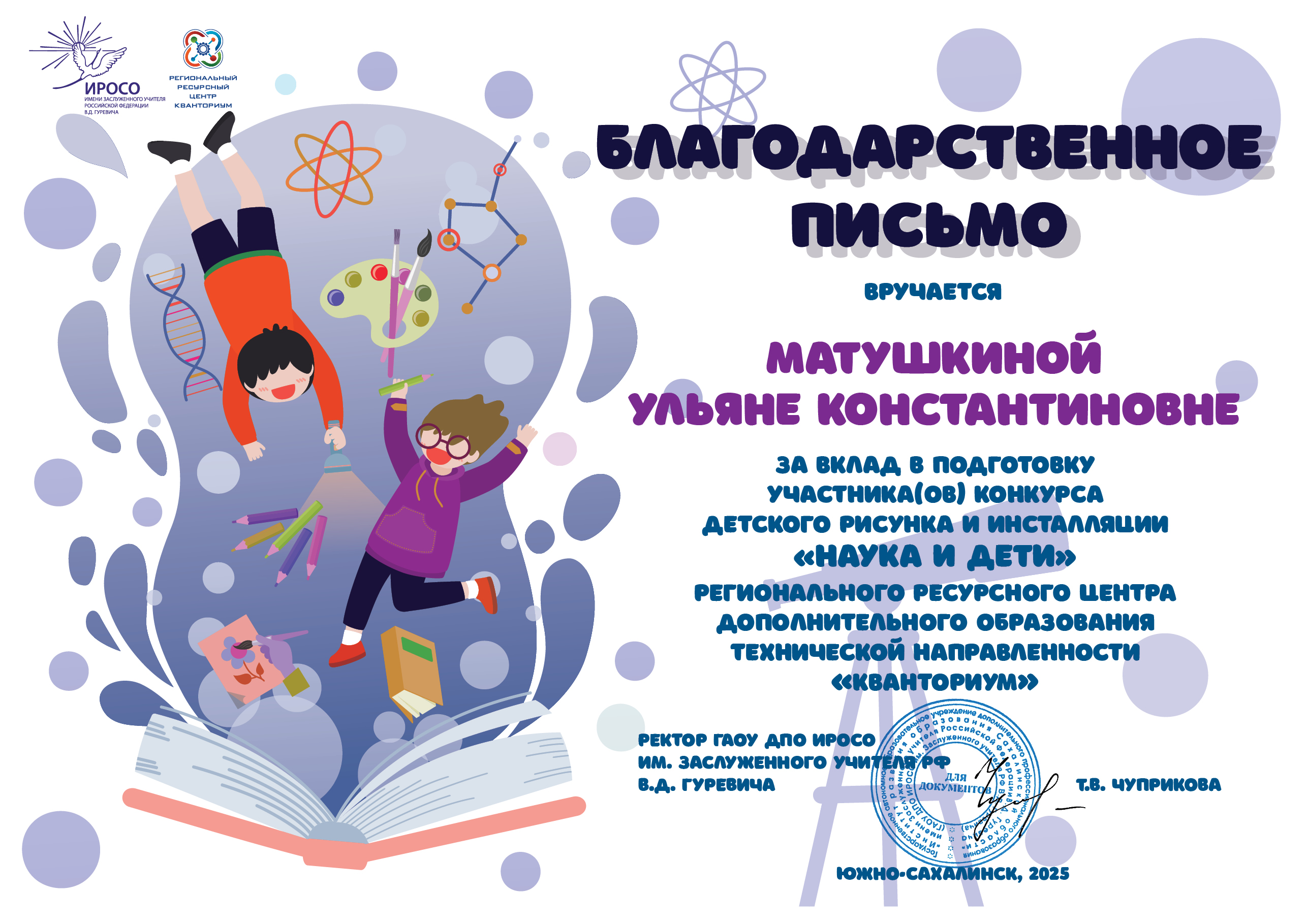 Благодарственное письмо за вклад в подготовку участников конкурса детского рисунка и инсталляции "Наука и дети" 2025 г.