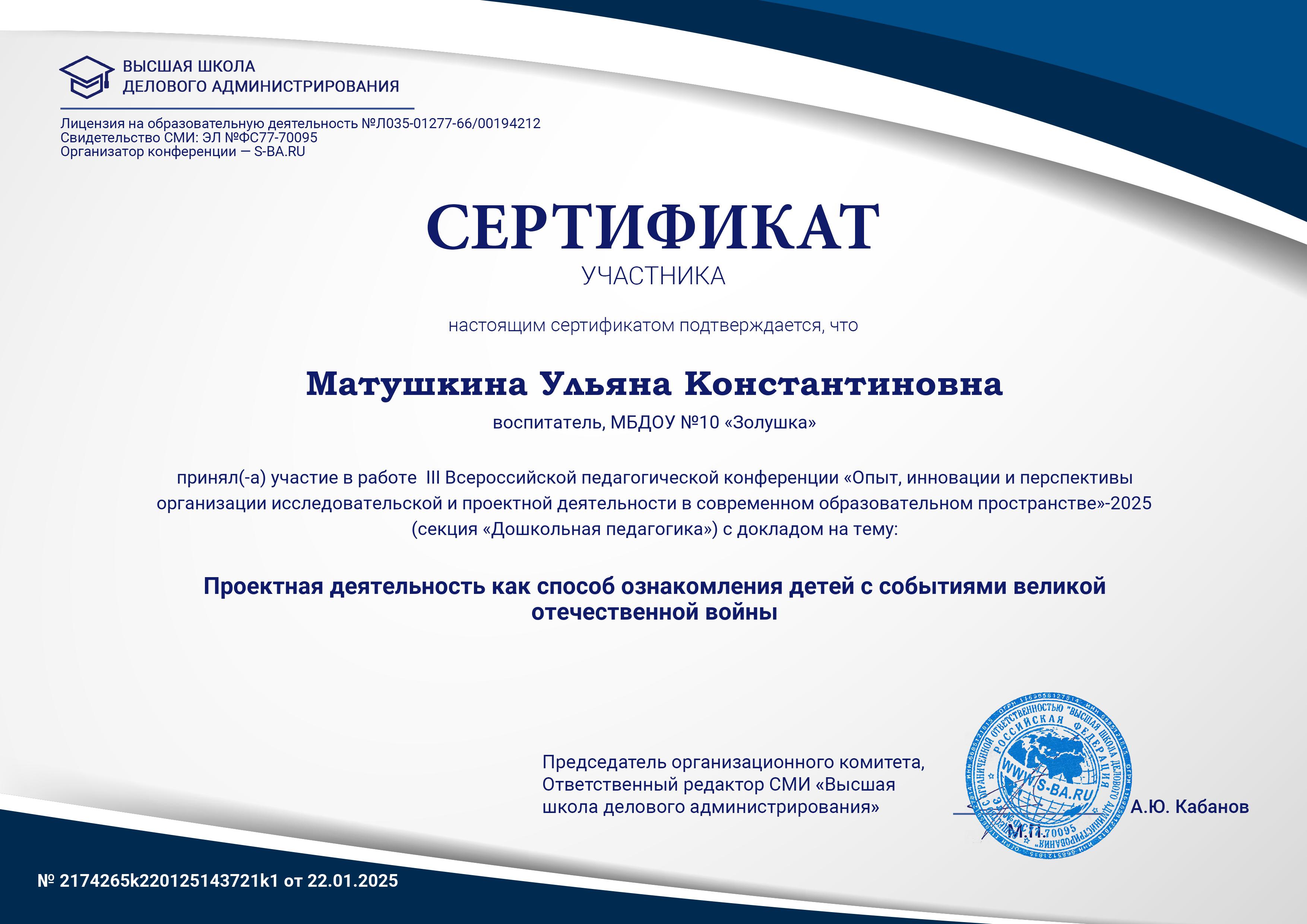 Сертификат приняла участие в работе III Всероссийской педагогической конференции "Опыт, инновации и перспективы организации исследовательской и проектной деятельности в современном образовательном пространстве" 2025