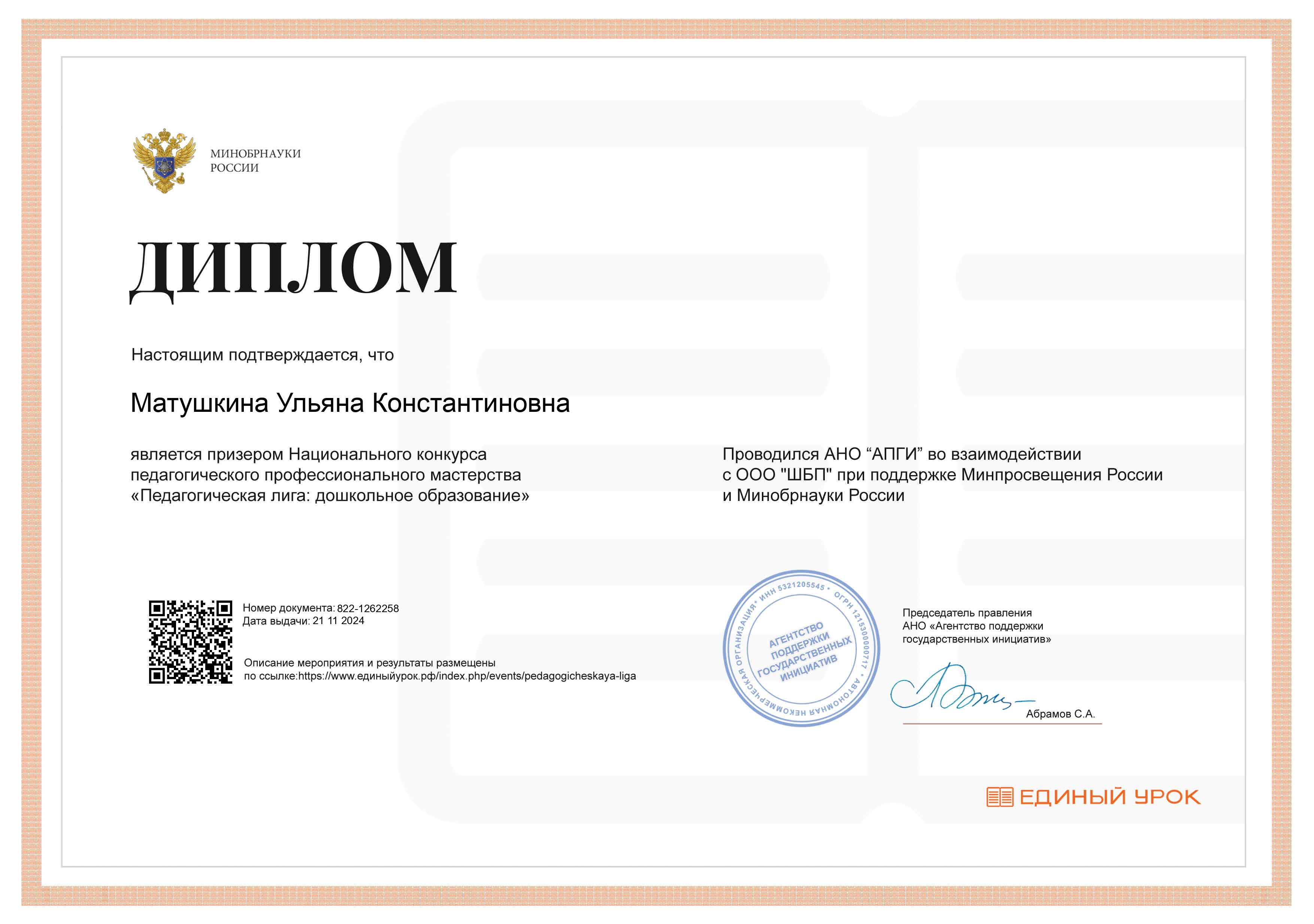 Диплом призера II Национального конкурса профессионального мастерства "Педагогическая лига: правовое воспитание детей молодежи" в номинации "Дошкольное образование" - 2024 г.